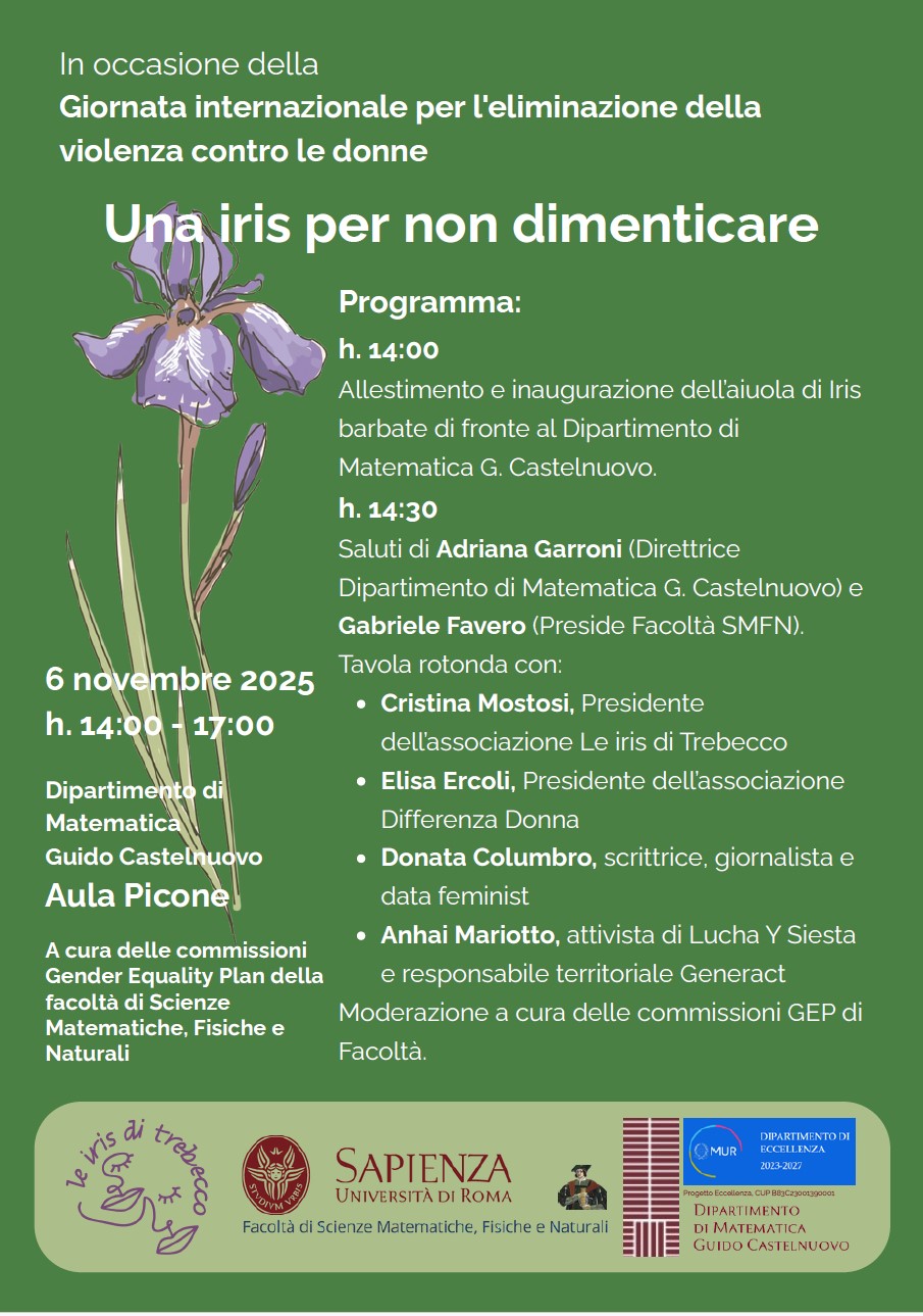 In particolare, il Dipartimento di Matematica si è fatto promotore della seguente iniziativa: "Una Iris per non dimenticare Paola Mastosi, Ilaria Sula e le altre donne vittime di violenza", giovedì 6 novembre 2025, ore 14.00, Aula Mauro Picone, Dipartimento di Matematica CU006.